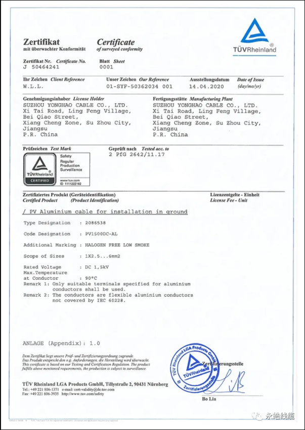 アルミ合金フォトボルスパイスケーブルファースト2pfg 2642テュフ小さなスクエア証明書